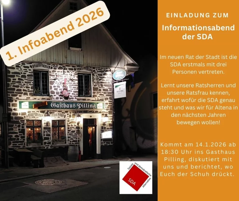 Wenn Ihr mehr über die Arbeit der SDA erfahren und wissen wollt, wie wir uns für die Interessen der Bürgerinnen und Bürger in Altena einsetzen, dann kommt am 13.März. ab 18:30 Uhr ins Gasthaus Pilling zum Infoabend der SDA.